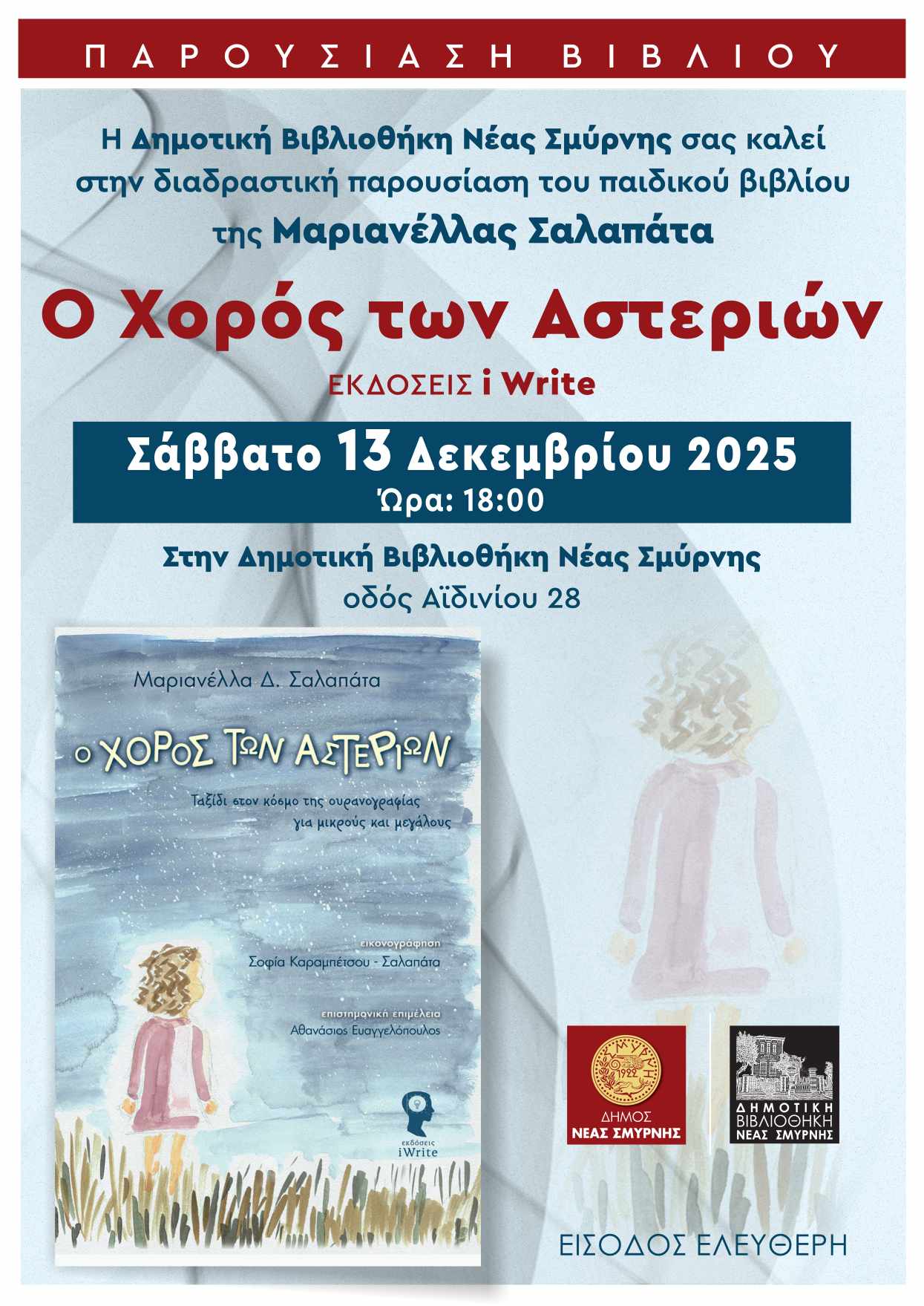 Η Δημοτική Βιβλιοθήκη της Νέας Σμύρνης, ανοίγει για ακόμα μία φορά τις πύλες της για το φιλανάγνωστο παιδικό κοινό της πόλης και διοργανώνει σε συνεργασία με τις εκδόσεις iWrite, την παρουσίαση του βιβλίου «Ο Χορός των Αστεριών», της συγγραφέας Μαρινέλλα Σαλαπάτα.