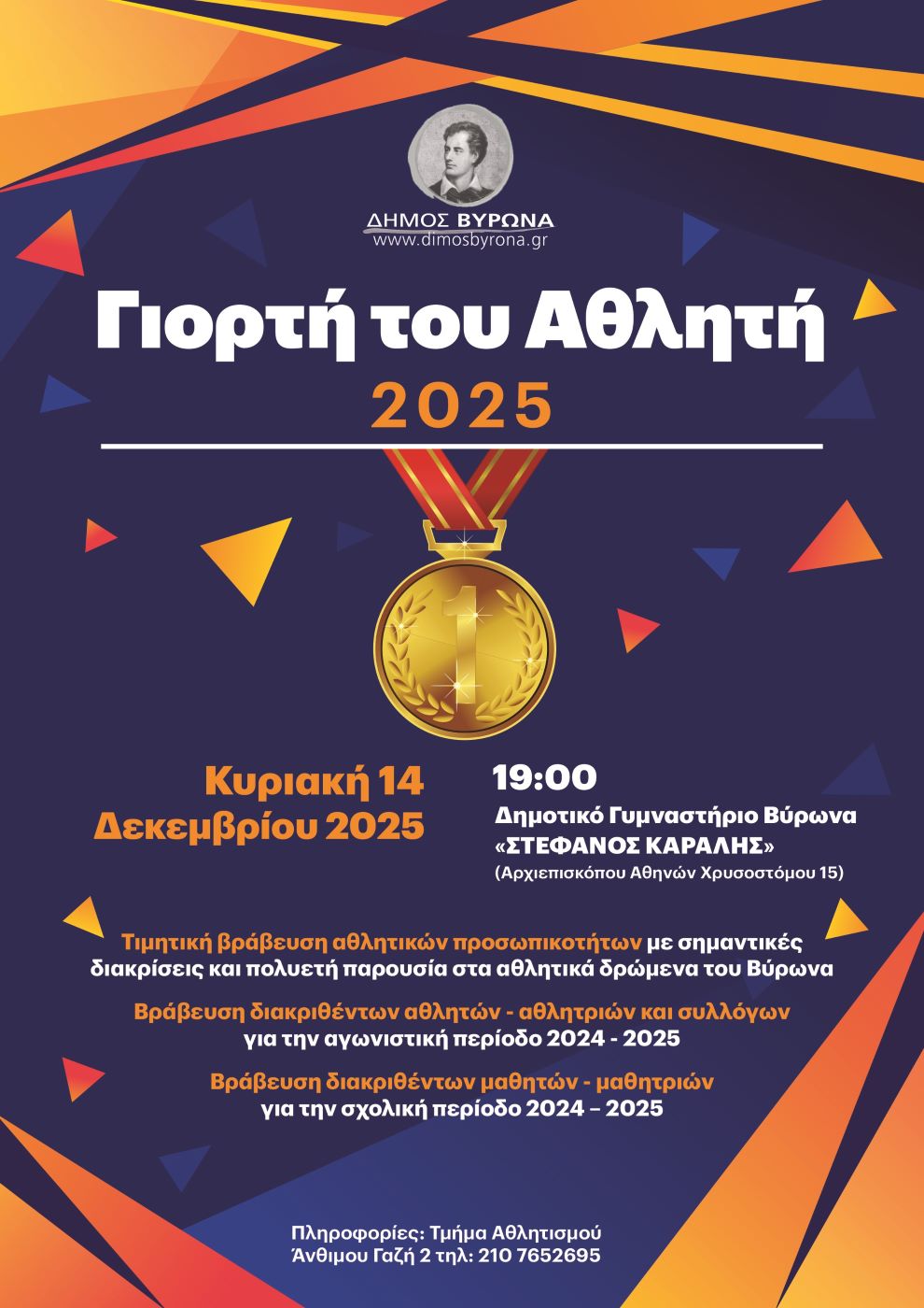 Μία μεγάλη «Γιορτή του Αθλητή» διοργανώνει και φέτος ο Δήμος Βύρωνα, μία εκδήλωση που αποτελεί πλέον θεσμό τιμής και αναγνώρισης για τους αθλητές, τις αθλήτριες και τα αθλητικά σωματεία της πόλης που διακρίθηκαν κατά το προηγούμενο έτος. Η εκδήλωση είναι ανοικτή στο κοινό.