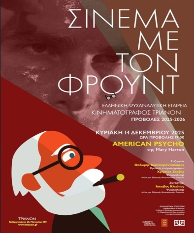 Η Ελληνική Ψυχαναλυτική Εταιρεία διοργανώνει, για 10η χρονιά, σειρά κινηματογραφικών προβολών με τίτλο «Σινεμά με τον Φρόυντ». Ο φετινός κύκλος πραγματοποιείται και πάλι σε συνεργασία με τον Κινηματογράφο Τριανόν.