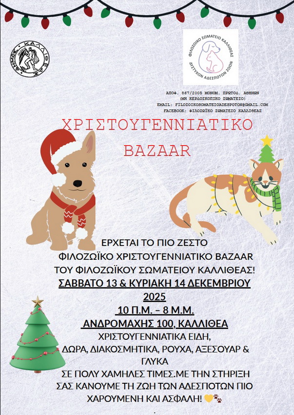 Πίστό στο ραντεβού του, το Φιλοζωϊκό Σωματείο Καλλιθέας διοργανώνει και φέτος το αγαπημένο Χριστουγεννιάτικο Bazaar, στις 13 και 14 Δεκεμβρίου.