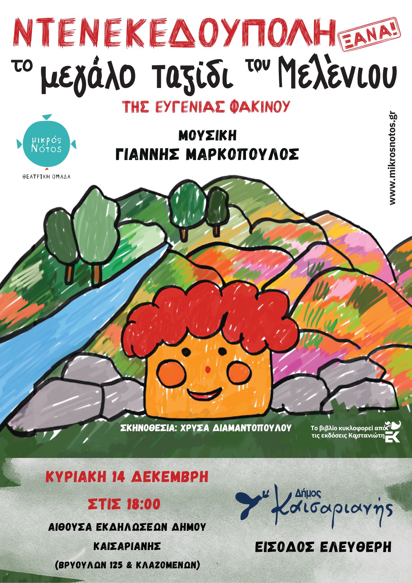 Η θεατρική παράσταση θα παρουσιαστεί την Κυριακή 14 Δεκεμβρίου στις 6 μ.μ. στην αίθουσα εκδηλώσεων του Δήμου Καισαριανής (Βρυούλων 125 & Κλαζομενών), με ελεύθερη είσοδο για το κοινό.