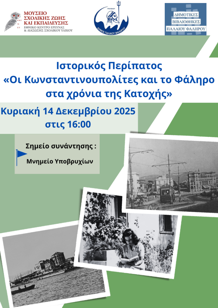 Ένα ταξίδι στο χρόνο πραγματοποιείται με τον Ιστορικό Περίπατο «Οι Κωνσταντινουπολίτες και το Φάληρο στα χρόνια της Κατοχής», που διοργανώνει ο Δήμος Παλαιού Φαλήρου σε συνεργασία με το Μουσείο Σχολικής Ζωής και Εκπαίδευσης, την Κυριακή 14 Δεκεμβρίου, στις 16.00, με σημείο συνάντησης το Μνημείο Υποβρυχίων.