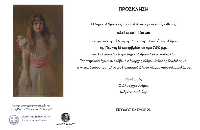 H εικαστική έκθεση «Αι γενεαί πάσαι» εγκαινιάζεται την Πέμπτη 18 Δεκεμβρίου στις 8:30 μ.μ. στο Πολιτιστικό Κέντρο του Δήμου Αλίμου (Λεωφ. Ιωνίας 96), με ελεύθερη είσοδο για το κοινό.