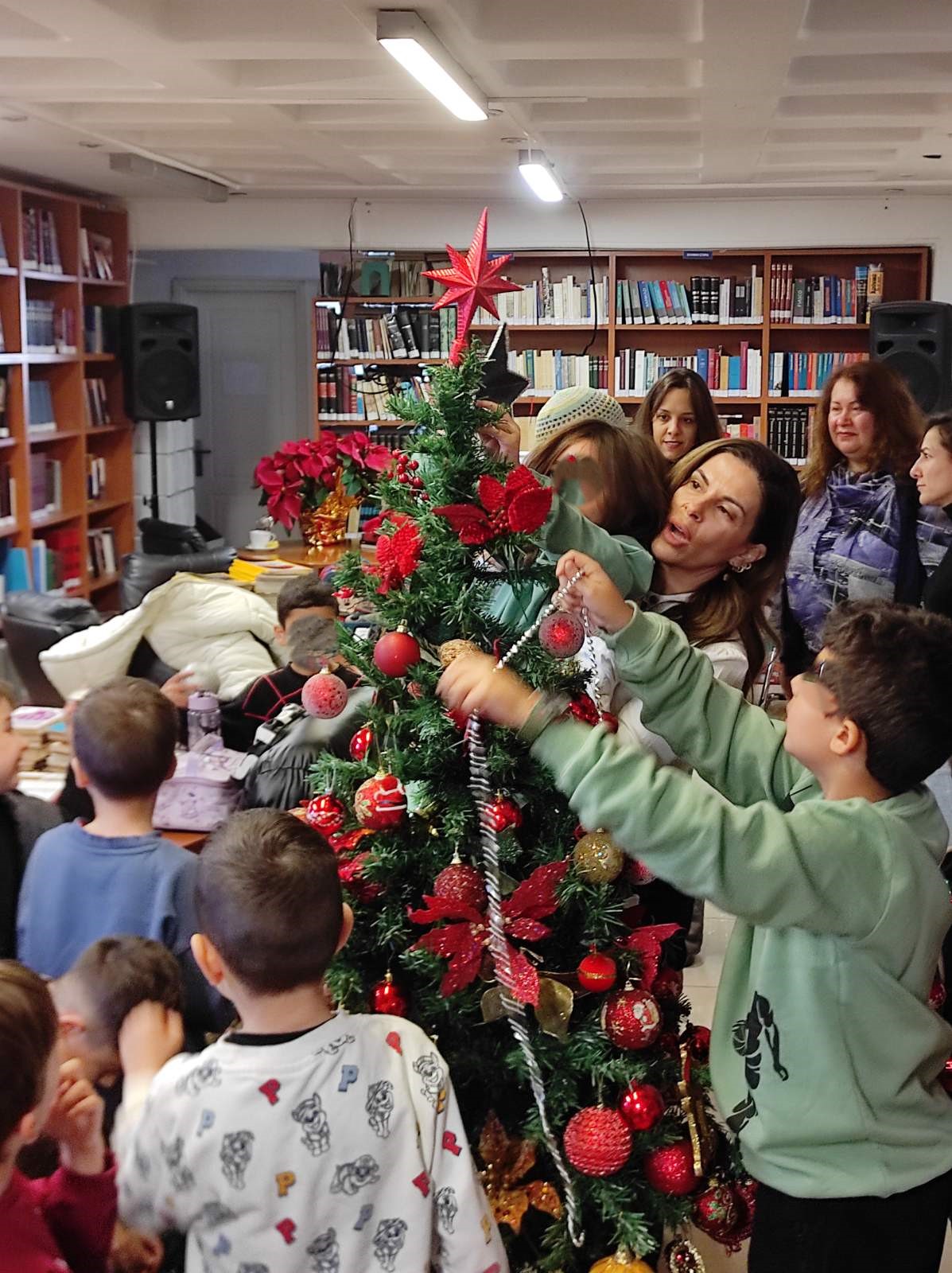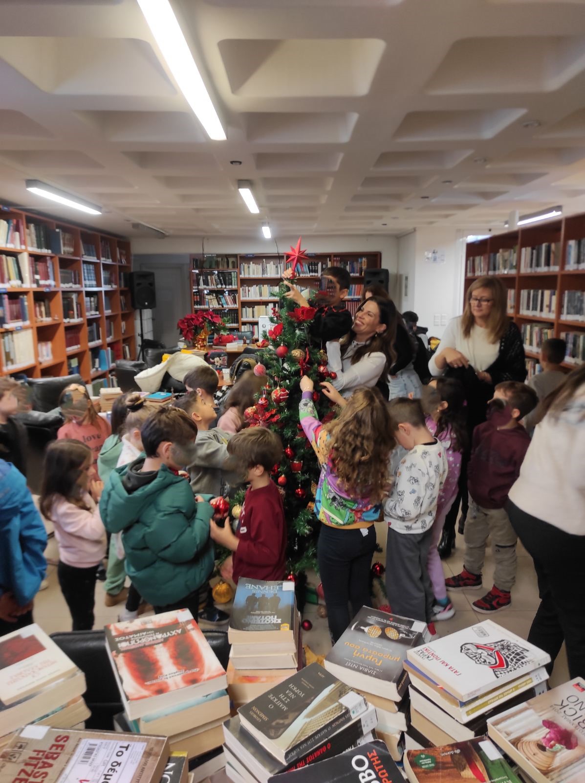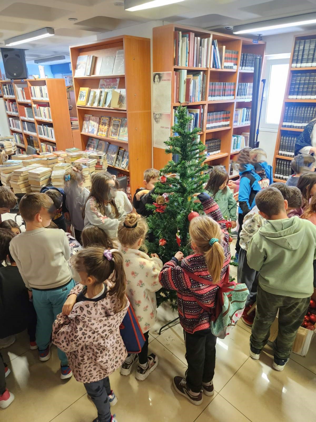 Ζωντάνεψε η Δημοτική Βιβλιοθήκη του Αγίου Δημητρίου την Τετάρτη 10 Δεκεμβρίου με τις φωνές και τα γέλια των μαθητών και των μαθητριών της Α’ και Β’ τάξης του 8ου Δημοτικού σχολείου της πόλης που βρέθηκαν εκεί για να στολίσουν το Χριστουγεννιάτικο Δέντρο.