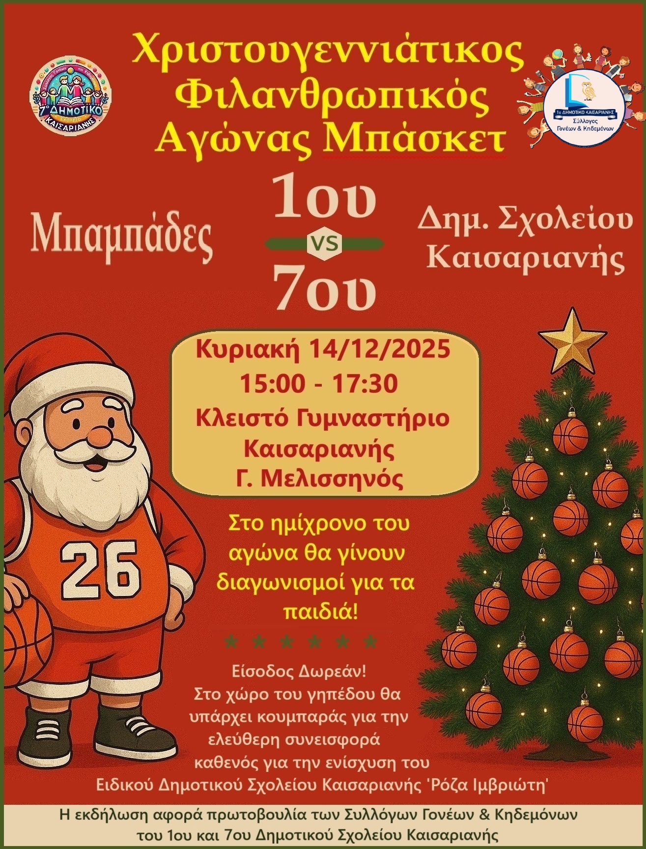 Ειδικότερα, συμμετέχουν ως αντίπαλοι στον χριστουγεννιάτικο φιλανθρωπικό αγώνα μπάσκετ, που διοργανώνουν οι Σύλλογοι Γονέων & Κηδεμόνων των δυο σχολείων που θα διεξαχθεί την Κυριακή 14 Δεκεμβρίου στις 3 μ.μ. στο κλειστό γυμναστήριο «Γ. Μελισσηνός» της πόλης.