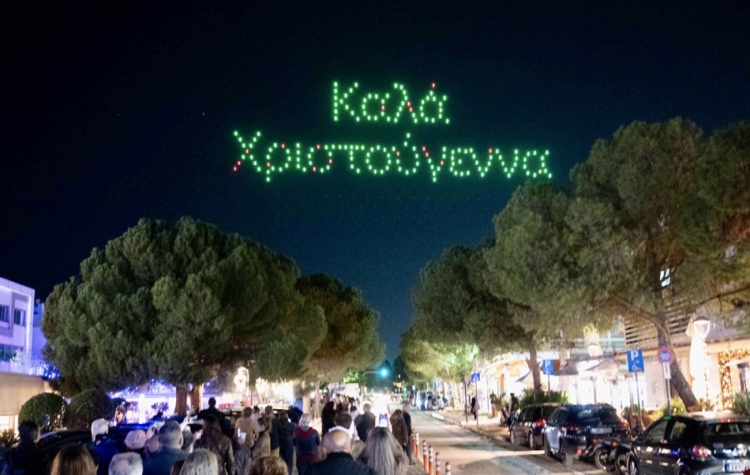 Ειδικότερα, στις 20:00, τα drones φώτισαν τον ουρανό, παρουσιάζοντας ένα φαντασμαγορικό υπερθέαμα με χριστουγεννιάτικα σχέδια, συμβολισμούς και ευχές του Δήμου.