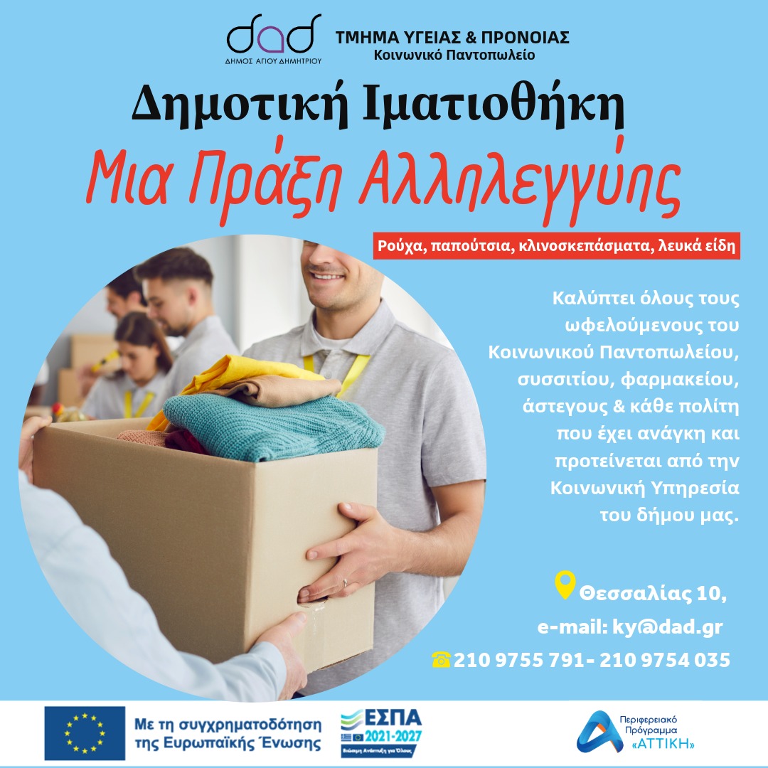 Αρχίζει επίσημα η λειτουργία της Ιματιοθήκης του Δήμου, που θα διανέμει είδη ρουχισμού, υποδήματα, κλινοσκεπάσματα κλπ σε άστεγους και άπορους πολίτες της πόλης, ωφελούμενους των Κοινωνικών Δομών, με το σύνθημα «Η Αλληλεγγύη είναι πράξη αγάπης».