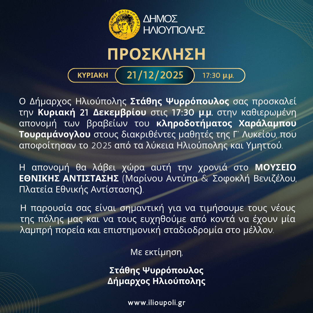 Την Κυριακή 21 Δεκεμβρίου 2025 θα πραγματοποειηθεί η καθιερωμένη τελετή απονομής των βραβείων του κληροδοτήματος «Χαράλαμπου Τουραμάνογλου» στους διακριθέντες μαθητές της Γ’ Λυκείου της πόλης, που αποφοίτησαν το 2025 από τα λύκεια Ηλιούπολης και Υμηττού.