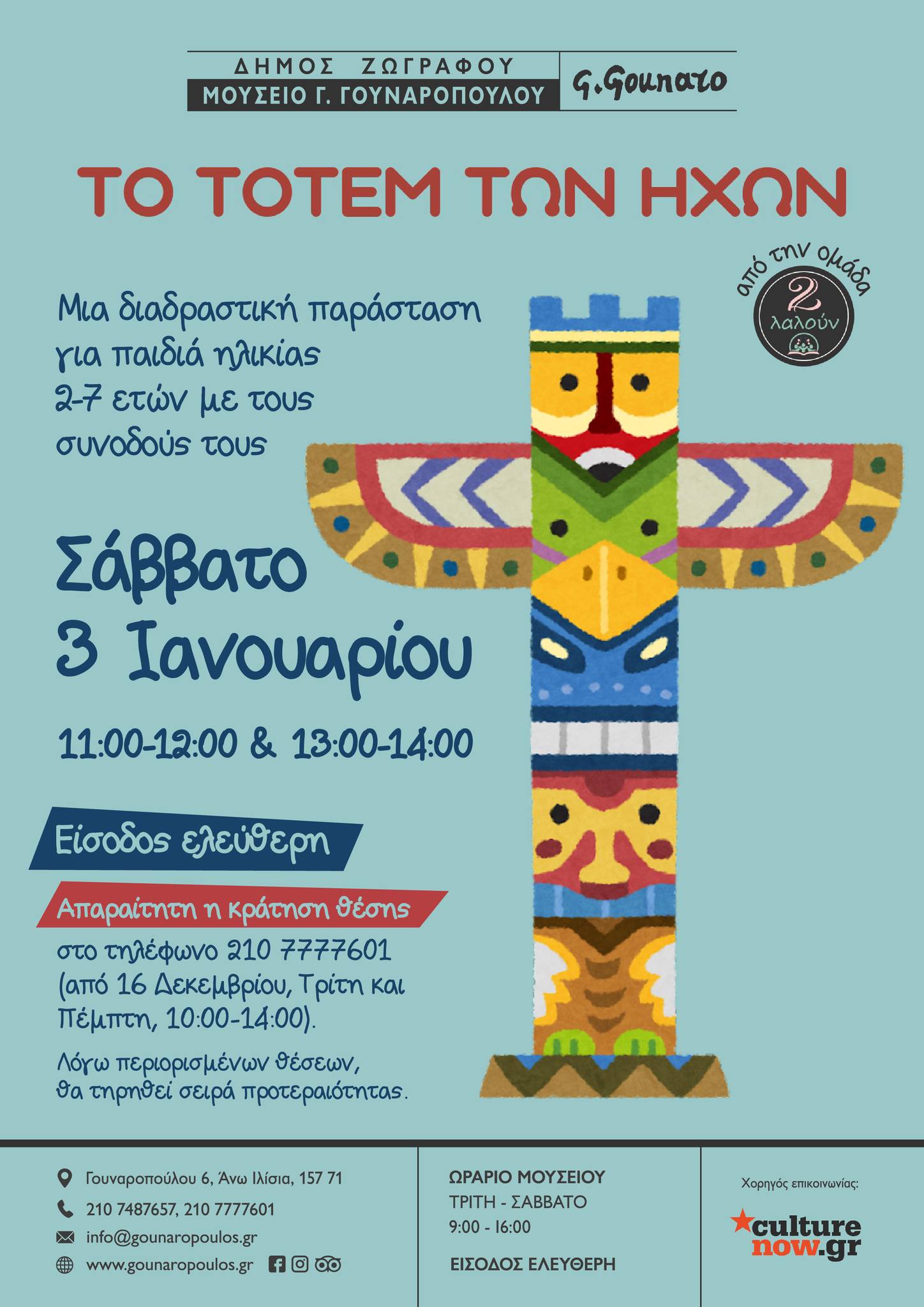 Με μια ξεχωριστή μουσικοχορευτική εμπειρία για παιδιά υποδέχεται το νέο έτος το Μουσείο Γ. Γουναρόπουλου. Το Σάββατο 3 Ιανουαρίου 2026, οι μικροί φίλοι του μουσείου καλούνται να συμμετάσχουν μία διαδραστική παράσταση «Το τοτέμ των ήχων», που παρουσιάζει η ομάδα 2 λαλούν.