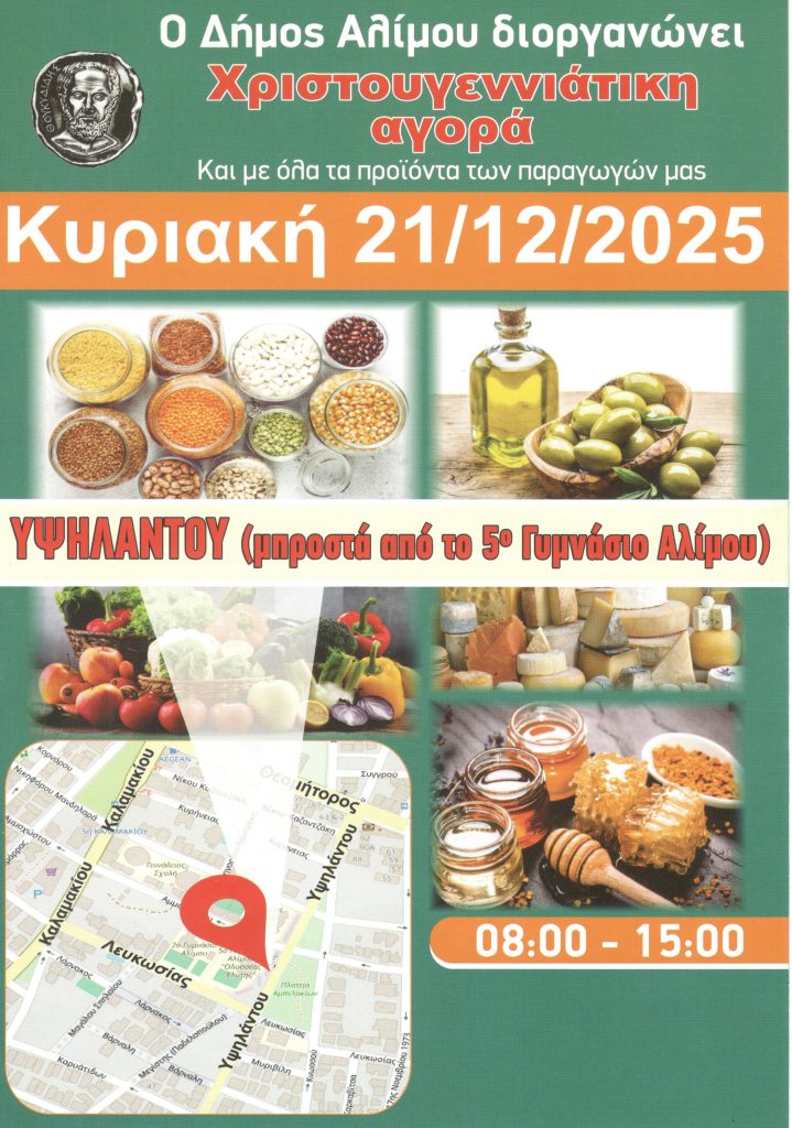 Συγκεκριμένα, η αγορά θα περιλλαμβάνει διάφορα προιόντα των τοπικών παραγωγών της πόλης και θα διεξαχθεί μπροστά από το 5ο Γυμνάσιο Αλίμου (Αμμοχώστου 38 & Υψηλάντου, Άλιμος) και ώρες 8:00 π.μ. με 15:00.