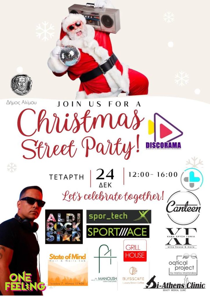 Ένα Χριστουγεννιάτικο Street Party διοργανώνουν τα καταστήματα του Άνω Καλαμακίου, στον Άλιμο ενόψει των εορτών, με ελληνικές και ξένες επιτυχίες των 80s-90s.