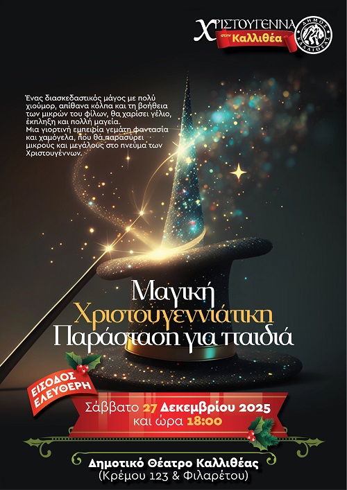 Το απόγευμα του Σαββάτου 27 Δεκεμβρίου, στις 18.00, στο Δημοτικό Θέατρο Καλλιθέας (Κρέμου 123 & Φιλαρέτου), θα παρουσιαστεί μία χριστουγεννιάτικη παράσταση για παιδιά. Ένας διασκεδαστικός μάγος, με πολύ χιούμορ και απίθανα κόλπα, θα χαρίσει γέλιο και χαρά στους μικρούς φίλους.