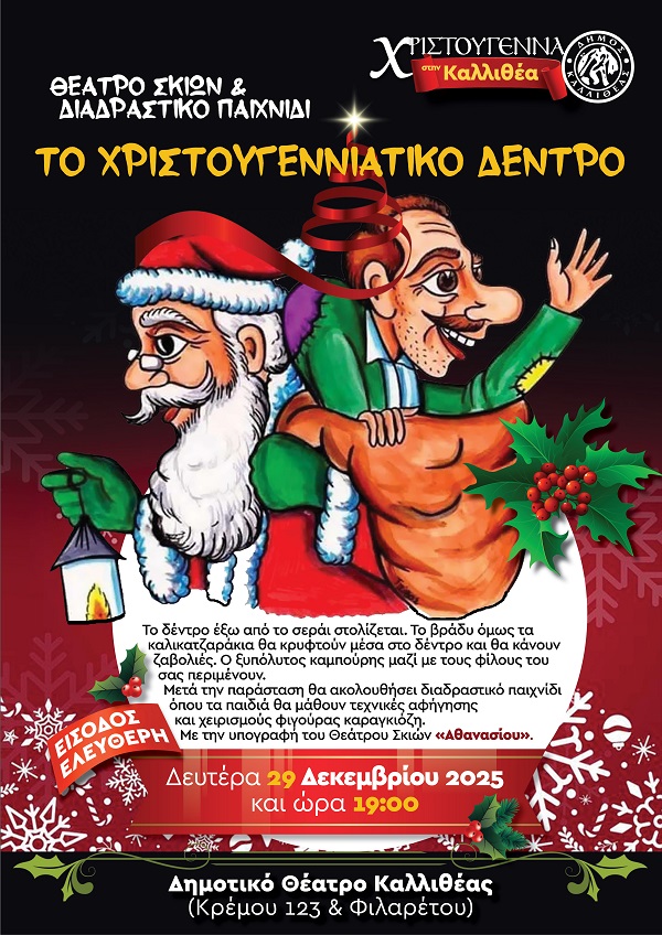 Τη Δευτέρα 29 Δεκεμβρίου, στις 19.00, στο Δημοτικό Θέατρο Καλλιθέας, θα παρουσιαστεί η παράσταση θεάτρου σκιών και διαδραστικού παιχνιδιού «Το Χριστουγεννιάτικο Δέντρο», με την υπογραφή του Θεάτρου Σκιών «Αθανασίου».