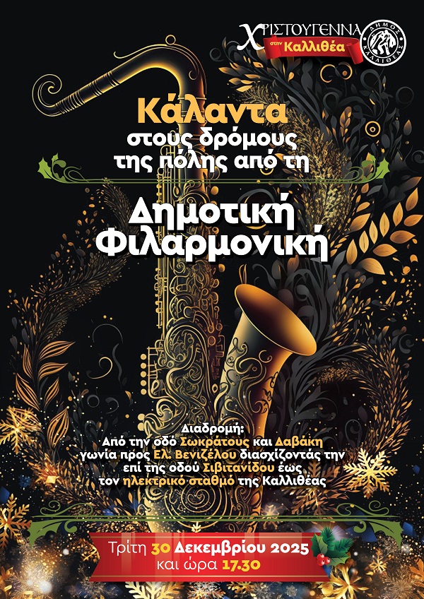 Την Τρίτη 30 Δεκεμβρίου, στις 17.30, η Δημοτική Φιλαρμονική θα περιηγηθεί στους δρόμους της πόλης, παρουσιάζοντας τα κάλαντα και μεταφέροντας το γιορτινό κλίμα σε κάθε γειτονιά.
