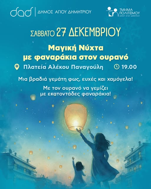 Μία χριστουγεννιάτικη βραδιά γεμάτη φως και ευχές διοργανώνει το Τμήμα Πολιτισμού, Αθλητισμού & Περιβάλλοντος του Δήμου Αγίου Δημητρίου, με πρωταγωνιστές τα ιπτάμενα φαναράκια.