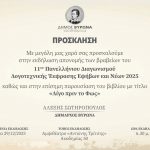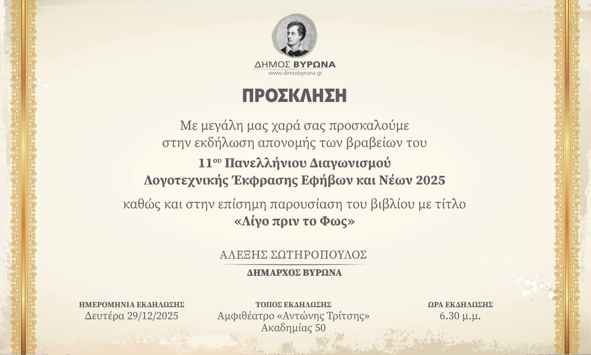 Η τελετή απονομής των βραβείων του 11ου Πανελλήνιου Διαγωνισμού Λογοτεχνικής Έκφρασης Εφήβων και Νέων 2025 θα λάβει χώρα στον Δήμο Βύρωνα, καθώς και η επίσημη παρουσίαση του βιβλίου με τίτλο «Λίγο πριν το Φως».