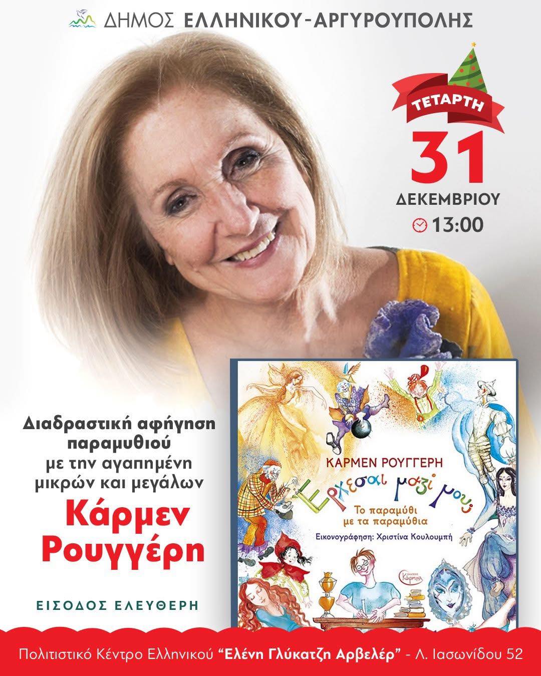 Ο Δήμος Ελληνικού-Αργυρούπολης αποχαιρετά την φετινή «Χριστουγεννοχώρα» με την αγαπημένη ηθοποιό, σκηνοθέτη, σεναριογράφο και συγγραφέα παιδικών βιβλίων Κάρμεν Ρουγγέρη, σε μια διαδραστική αφήγηση του παραμυθιού με τ΄τιλο «Έρχεσαι μαζί μου;» για τους μικρούς δημότες.