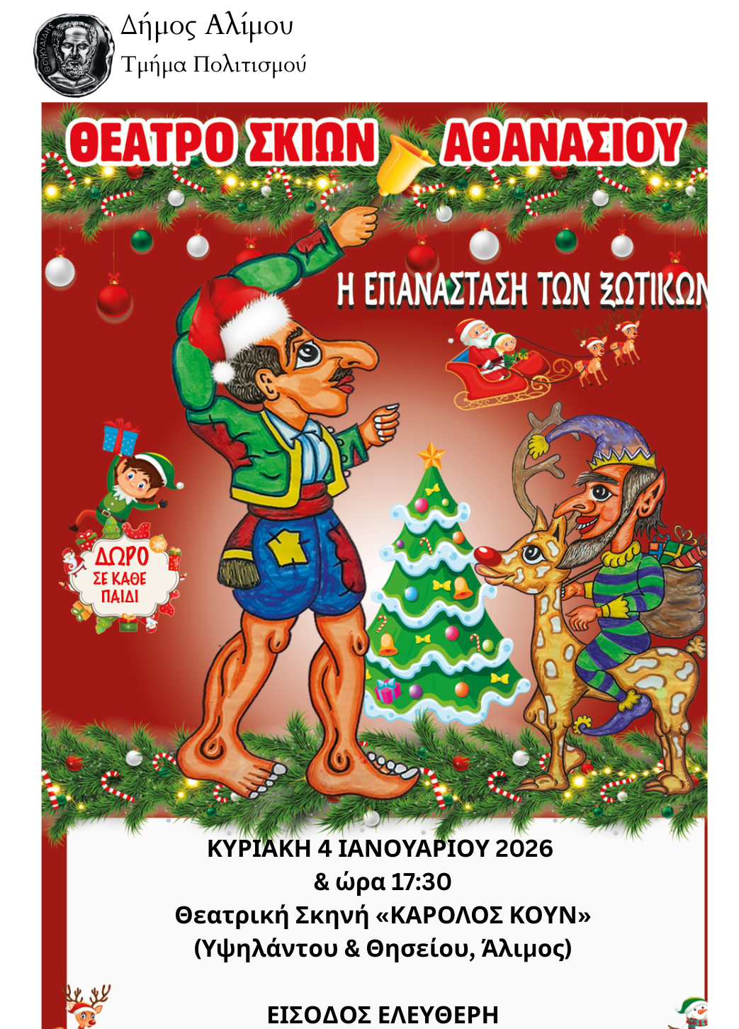 Το «Θέατρο Σκιών Αθανασίου» επιστρέφει στον Δήμο Αλίμου για άλλη μία παράσταση, αυτήν τη φορά με πρωταγωνιστές τα ξωτικά των Χριστουγέννων.