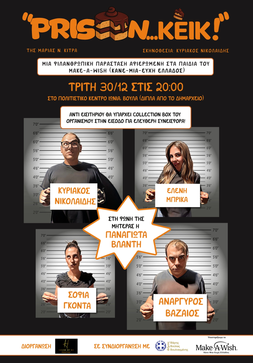 Την φιλανθρωπική θεατρική παράσταση «Prison… Κείκ!», αφιερωμένη στα παιδιά του Make-A-Wish (Κάνε-Μια-Ευχή Ελλάδος), παρουσιάζουν η «House of NK Productions» και ο Δήμος Βάρης Βούλας Βουλιαγμένης, την Τρίτη 30 Δεκεμβρίου στις 20:00, στο Πολιτιστικό Κέντρο «Ιωνία».