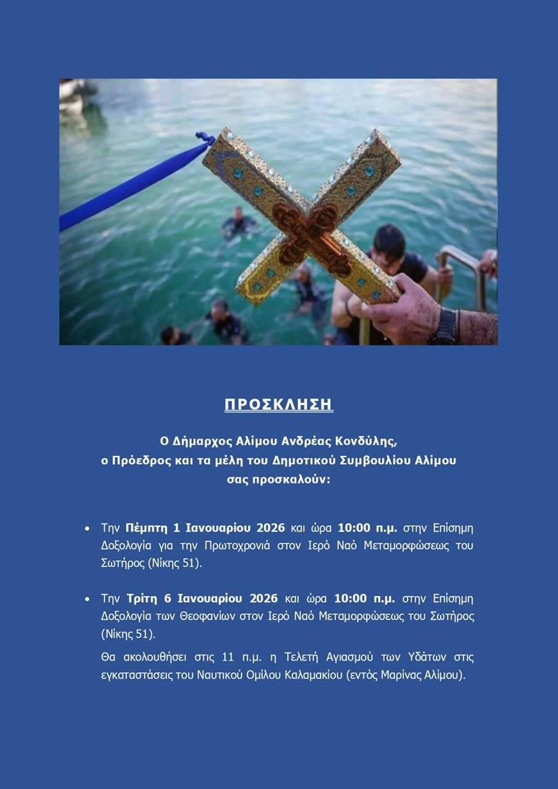 Ανήμερα των Θεοφανίων, την Τρίτη 6 Ιανουαρίου 2026 στις 10:00 π.μ., θα λάβει χώρα η Επίσημη Δοξολογία των Θεοφανίων στον Ιερό Ναό Μεταμορφώσεως του Σωτήρος (Νίκης 51), του Δήμου Αλίμου.