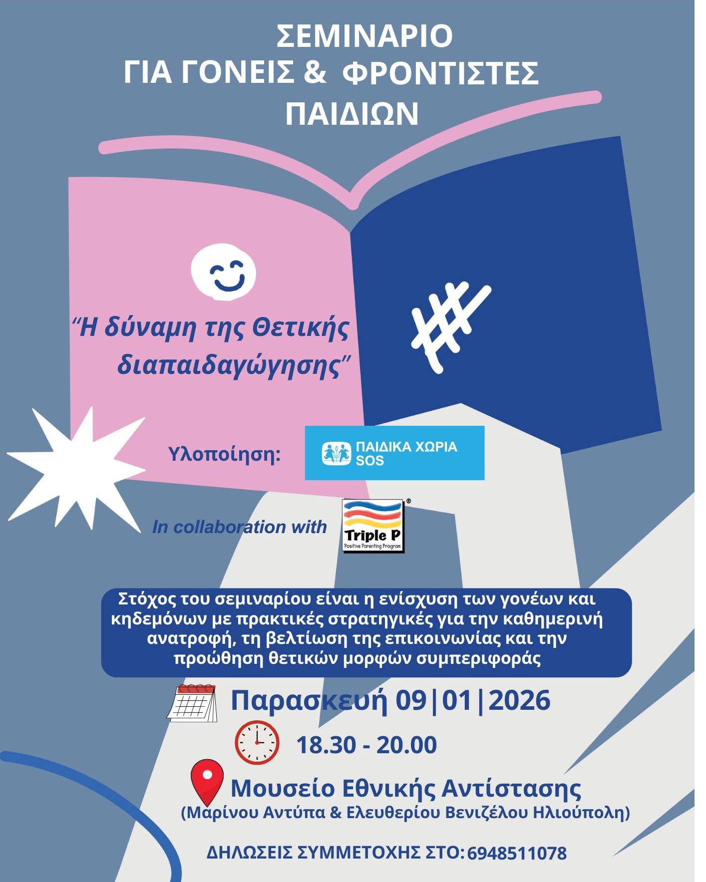Πρόκειται για ένα σεμινάριο που απευθύνεται σε Γονείς & Φροντιστές παιδιών με τίτλο «Η Δύναμη της Θετικής Διαπαιδαγώγησης» που θα λάβει χώρα την Παρασκευή 9 Ιανουαρίου 2026 στις 18:30 στο Μουσείο Εθνικής Αντίστασης (Μαρίνου Αντύπα & Ελευθερίου Βενιζέλου, Ηλιούπολη) και υλοποιείται στο πλαίσιο του σχετικού μνημονίου συνεργασίας που έχει υπογραφεί με τον Δήμο Ηλιούπολης και τα Παιδικά Χωριά SOS Ελλάδας.