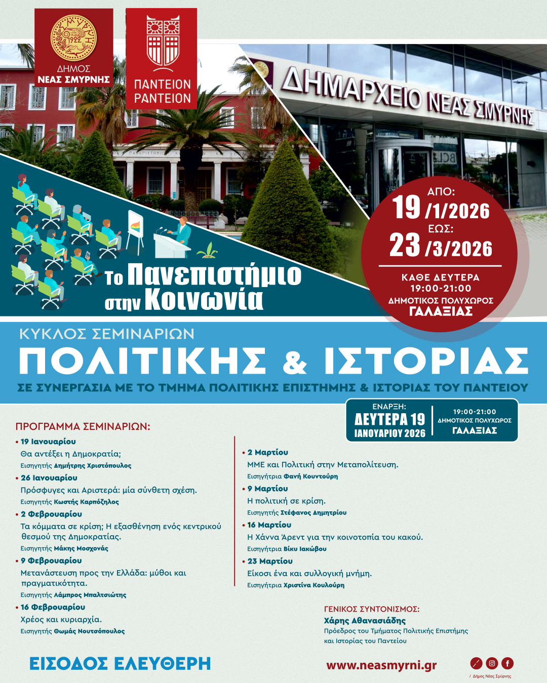 Νέα σεμινάρια ιστορίας θα λάβουν χώρο στον Δήμο Νέας Σμύρνης, σε συνεργασία με το Πάντειο Πανεπιστήμιο.