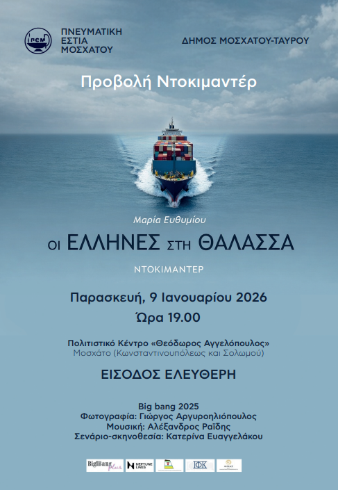 Με μία μοναδική πολιτιστική βραδιά υποδέχεται το νέο έτος ο Δήμος Μοσχάτου-Ταύρου και η Πνευματική Εστία του Μοσχάτου, με την προβολή του ντοκιμαντέρ της Μαρίας Ευθυμίου, με τίτλο «Οι Έλληνες στη Θάλασσα».