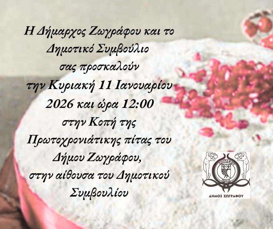 Την κοπή της πρωτοχρονιάτικης πίτας του θα πραγματοποιήσει Δήμος Ζωγράφου, σε μία ανοιχτή εκδήλωση για όλους τους δημότες.