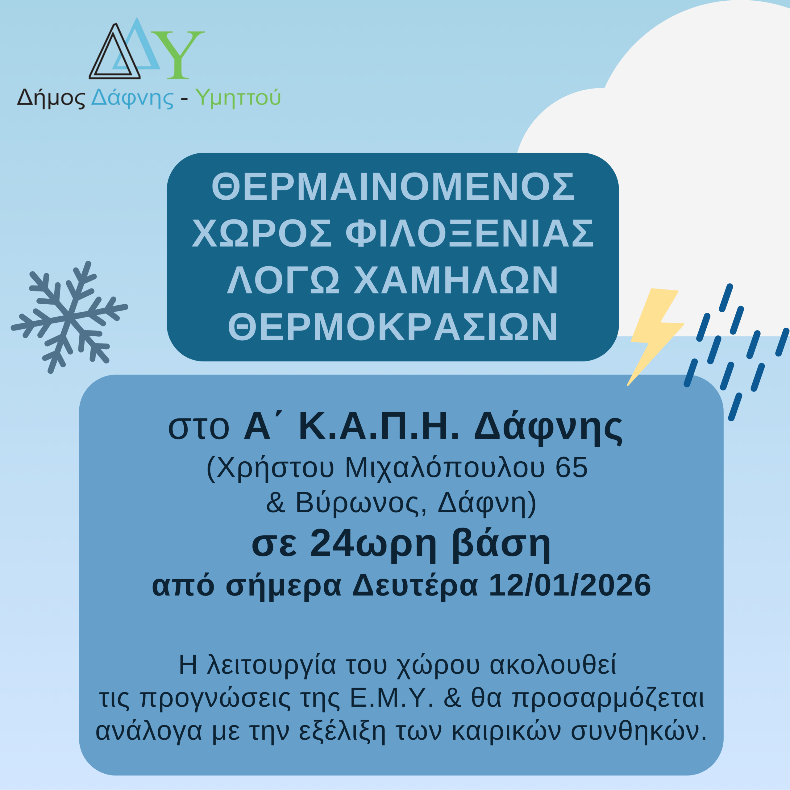 Ο Δήμος Δάφνης-Υμηττού έχει θέσει σε λειτουργία θερμαινόμενο χώρο φιλοξενίας, λόγω των χαμηλών θερμοκρασιών, στο Α’ Κ.Α.Π.Η. Δάφνης (Χρήστου Μιχαλόπουλου 65 & Βύρωνος, Δάφνη) σε 24ωρη βάση, από τη Δευτέρα 12/01/2026, για τη φιλοξενία και προστασία πολιτών από το ψύχος.