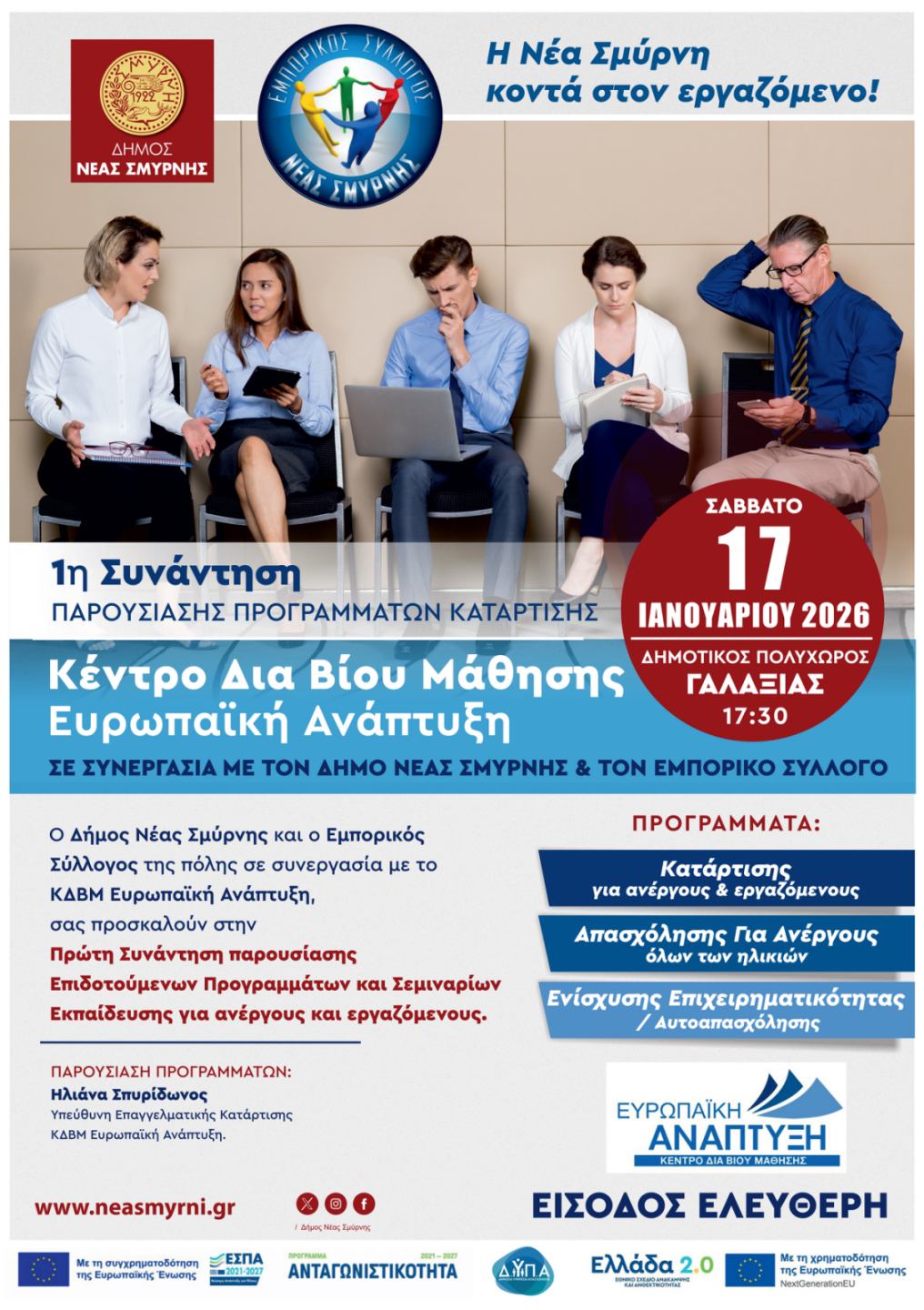 Ο Δήμος Νέας Σμύρνης, σε συνεργασία με τον Εμπορικό Σύλλογο Νέας Σμύρνης και το ΚΕΚ «Ευρωπαϊκή Ανάπτυξη» διοργανώνουν ενημερωτική εκδήλωση με θέμα τα επιδοτούμενα προγράμματα, με ομιλήτρια την Ηλιάνα Σπυρίδωνος, υπεύθυνη προγραμμάτων και διευθύντρια Κατάρτισης στο Κέντρο Δια Βίου Μάθησης «Ευρωπαϊκή Ανάπτυξη».