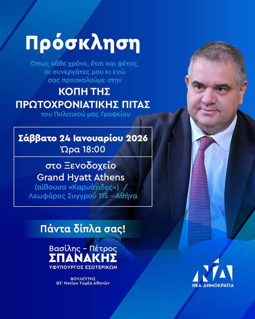 Με αφορμή την έναρξη της νέας χρονιάς, ο υφυπουργός εσωτερικών και βουλευτής Β3′ Νοτίου Τομέα Αθηνών της Νέας Δημοκρατίας Βασίλης Σπανάκης και οι συνεργάτες του διοργανώνουν την καθιερωμένη εκδήλωση κοπής της πρωτοχρονιάτικης πίτας του πολιτικού του γραφείου και απευθύνουν ανοιχτή πρόσκληση σε φίλες, φίλους και πολίτες.