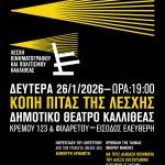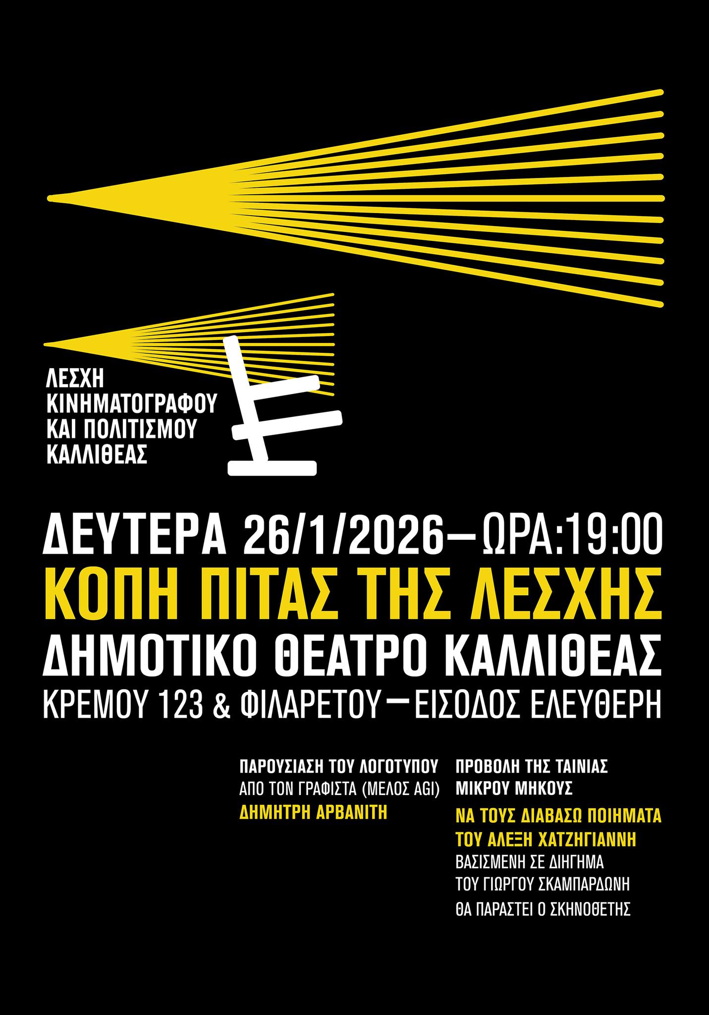 Τη Δευτέρα 26 Ιανουαρίου 2026 και ώρα 7 μ.μ., στο Δημοτικό Θέατρο της πόλης, η Λέσχη Κινηματογράφου και Πολιτισμού Καλλιθέας διοργανώνει την κοπή της πρωτοχρονιάτικης πίτας της για το νέο έτος.