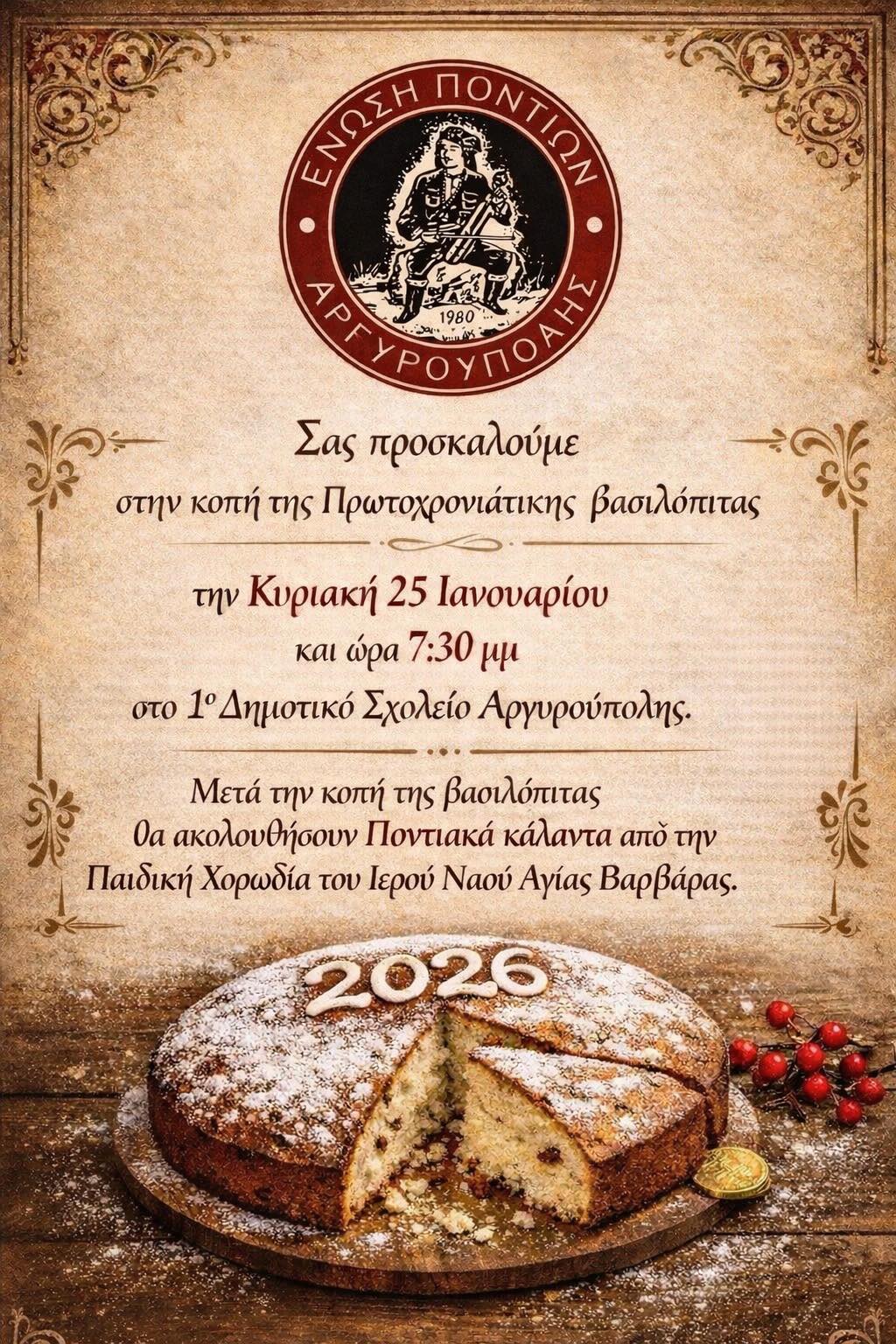 Την πρωτοχρονιάτυικη βασιλόπιτα της κόβει η Ένωση Ποντίων Αργυρούπολης, σε μία εκδήλωση που θα συνοδευτεί με μουσική, ευχές και ποντιακό γλέντι.
