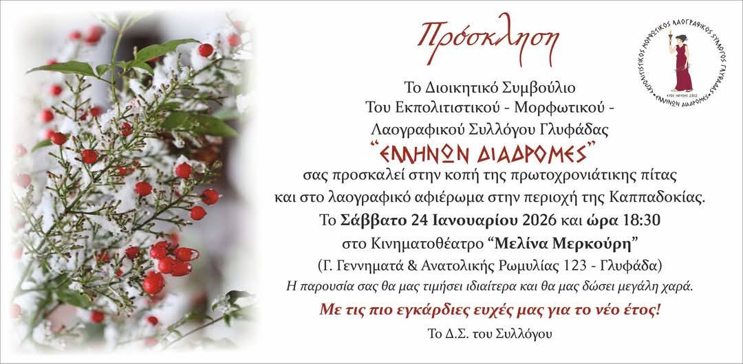 Στα βάθη της Ανατολής, στη θρυλική Καππαδοκία ταξιδεύει ο Εκπολιτιστικός – Μορφωτικός – Λαογραφικός Σύλλογος Γλυφάδας «Ελλήνων Διαδρομές», με αφορμή την εκδήλωση της κοπής της πρωτοχρονιάτικης πίτας του.