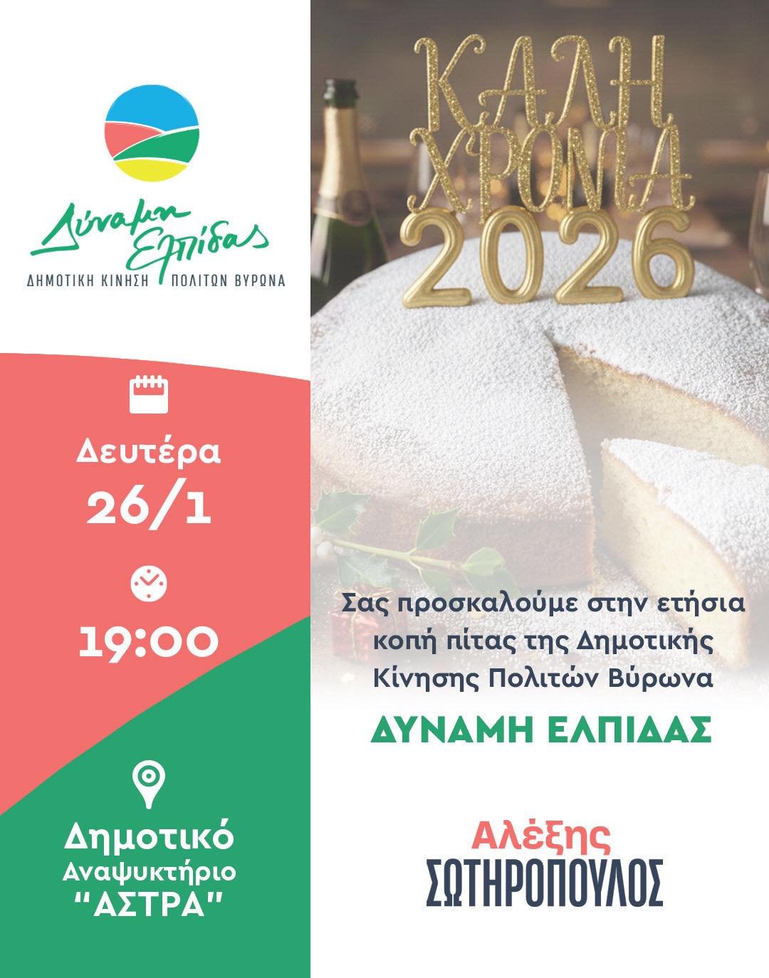 Η εκλεγμένη δημοτική παράταξη του Δήμου Βύρωνα «Δύναμη Ελπίδας» διοργανώνει την ετήσια κοπή της πρωτοχρονιάτικης βασιλόπιτας της και καλεί όλους τους δημόπτες και φίλους.