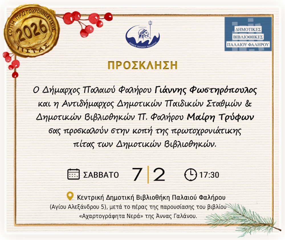 Την ετήσια κοπή της πρωτοχρονιάτικης πίτας τους διοργανώνουν οι Δημοτικές Βιβλιοθήκες του Δήμου Παλαιού Φαλήρου, σε μία ανοιχτή εκδήλωση το Σάββατο 7 Φεβρουαρίου και ώρα 17:30, στην Κεντρική Δημοτική Βιβλιοθήκη (Αγίου Αλεξάνδρου 5).