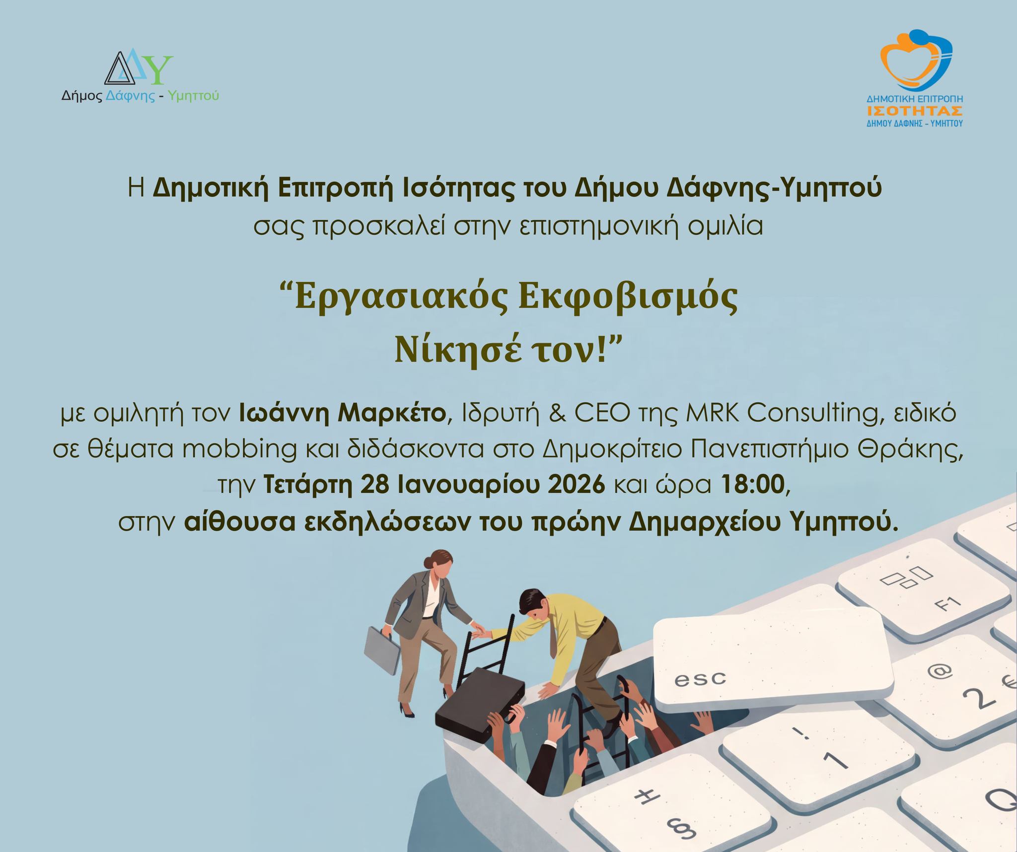 Μία επιστημονική ομιλία με θέμα «Εργασιακός Εκφοβισμός: Νίκησέ τον!» διοργανώνει η Δημοτική Επιτροπή Ισότητας του Δήμου Δάφνης-Υμηττού.