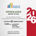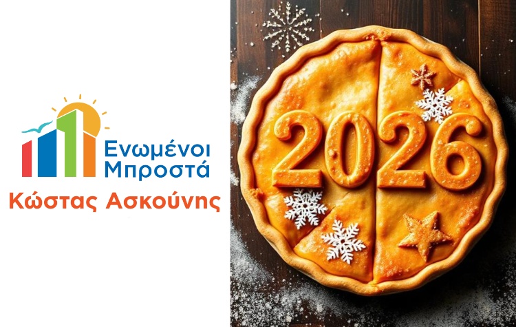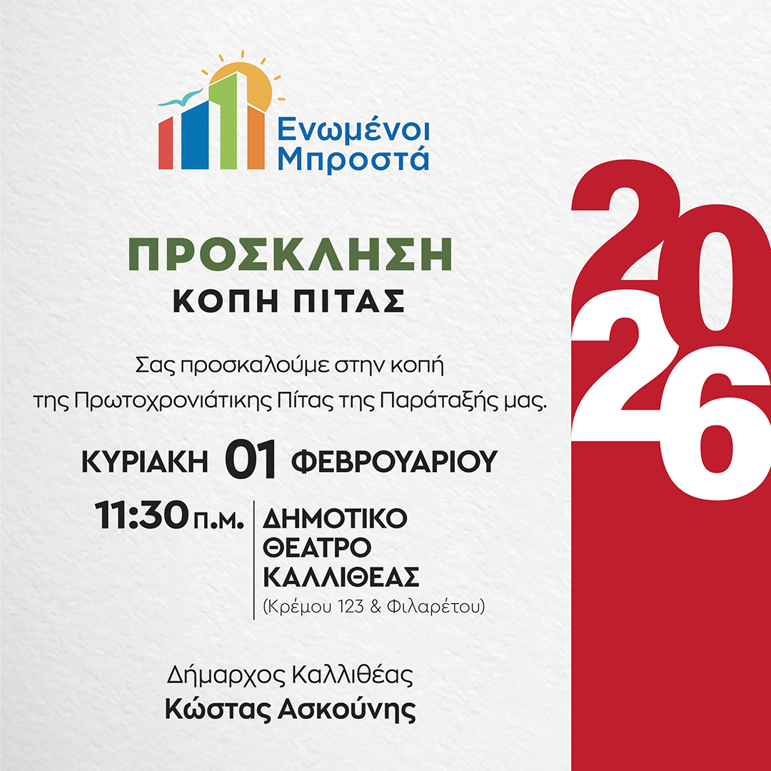 Την πρωτοχρονιάτικη πίτα της κόβει η δημοτική παράταξη «Ενωμένοι Μπροστά», με επικεφαλής τον δήμαρχο Καλλιθέας Κώστα Ασκούνη, την Κυριακή 1 Φεβρουαρίου 2026, στις 11:30 π.μ., στο Δημοτικό Θέατρο Καλλιθέας (Κρέμου 123 & Φιλαρέτου).