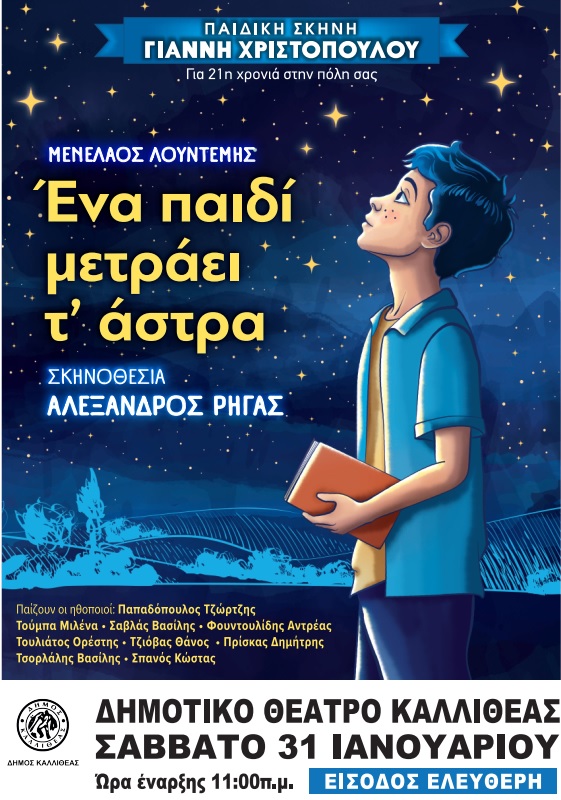 Η αγαπημένη θεατρική παράσταση «Ένα παιδί μετράει τ’ άστρα» έρχεται στο Δημοτικό Θέατρο Καλλιθέας, προσκαλώντας μικρούς και μεγάλους σε μια ξεχωριστή θεατρική εμπειρία αφιερωμένη στη δύναμη της γνώσης, του σχολείου και του δασκάλου.