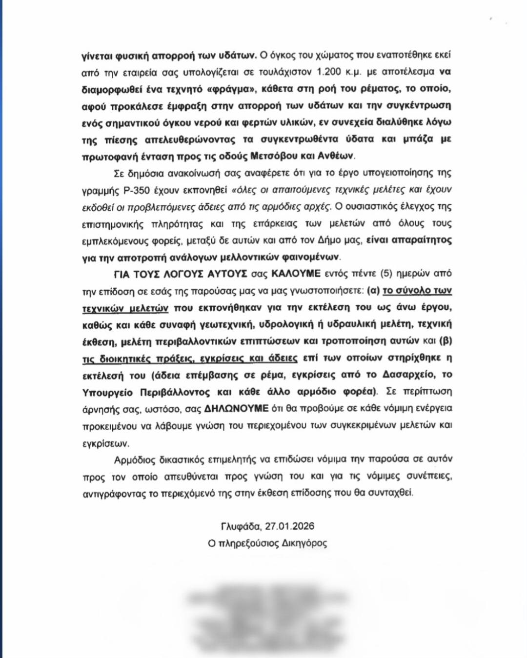 Με την εξώδικη πρόσκληση, ο Δήμος Γλυφάδας απαιτεί τη δημοσιοποίηση: