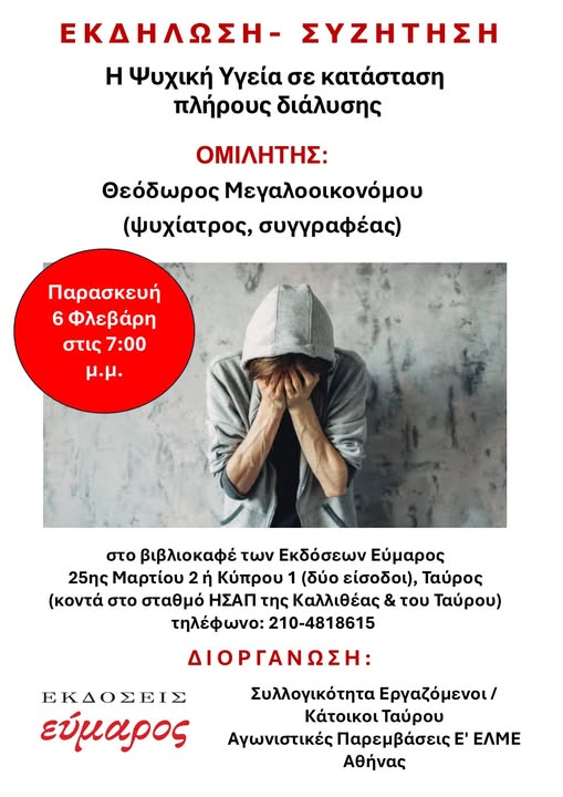 Μία εκδήλωση-συζήτηση με θέμα «Η Ψυχική Υγεία σε κατάσταση πλήρους διάλυσης» θα πραγματοποιηθεί στον Ταύρο, με ομιλητή τον ψυχίατρο και συγγραφέα Θεόδωρο Μεγαλοοικονόμου.