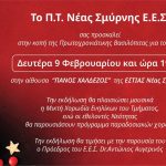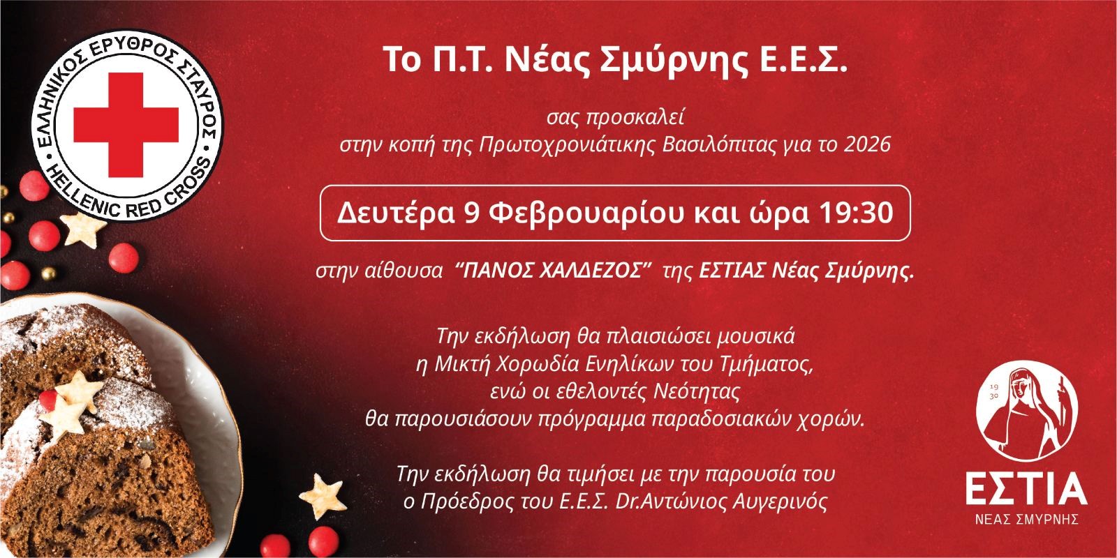 Η κοπή της πρωτοχρονιάτικης πίτας του Παραρτήματος Νέας Σμύρνης του Ελληνικού Ερυθρού Σταυρού θα λάβει χώρα τη Δευτέρα 9 Φεβρουαρίου και ώρα 19:30, στην αίθουσα «Πάνος Χαλδέζος» της Εστίας Νέας Σμύρνης.