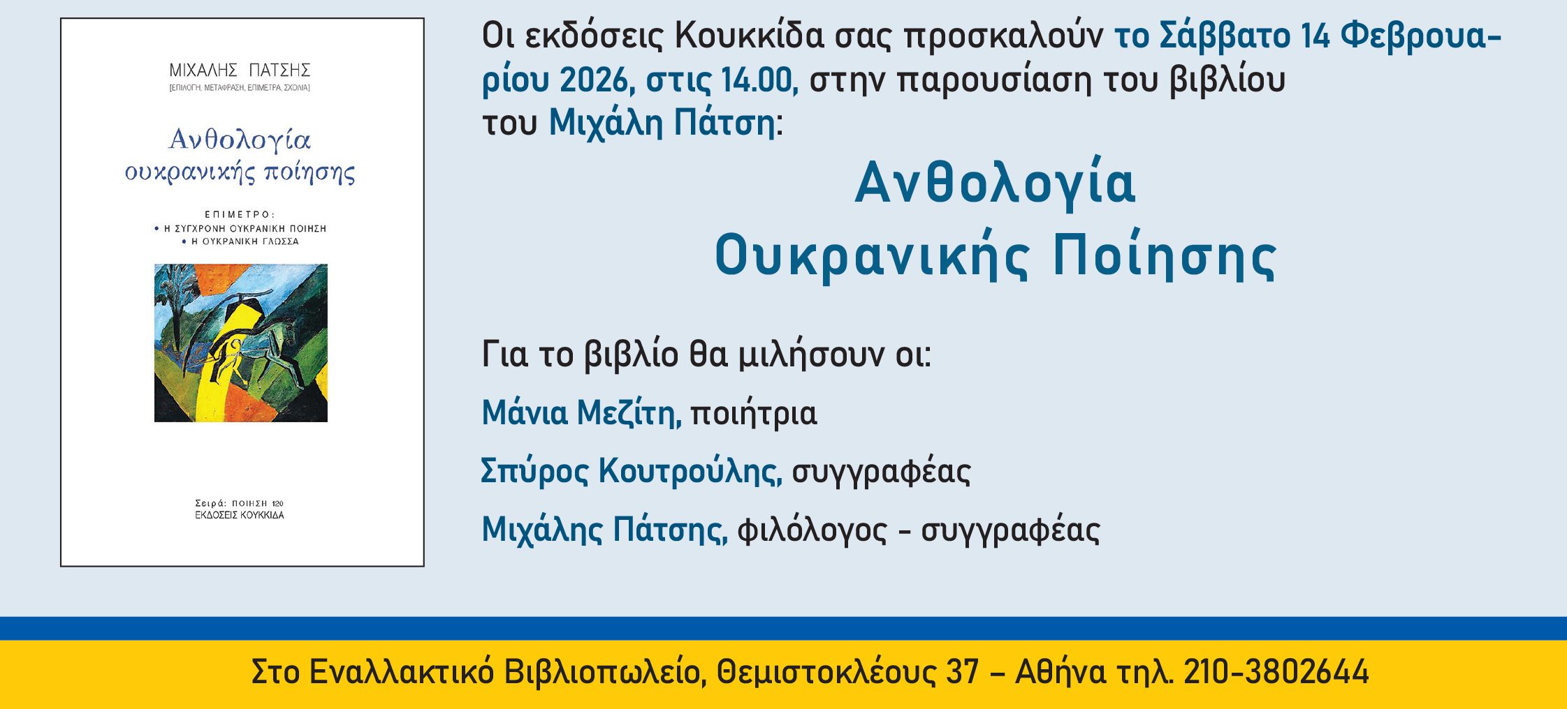 Την παρουσίαση του βιβλίου του Μιχάλη Πάτση, με τίτλο «Ανθολογία Ουκρανικής Ποίησης» διοργανώνουν οι εκδόσεις Κουκκίδα το Σάββατο 14 Φεβρουαρίου 2026, στις 14:00.