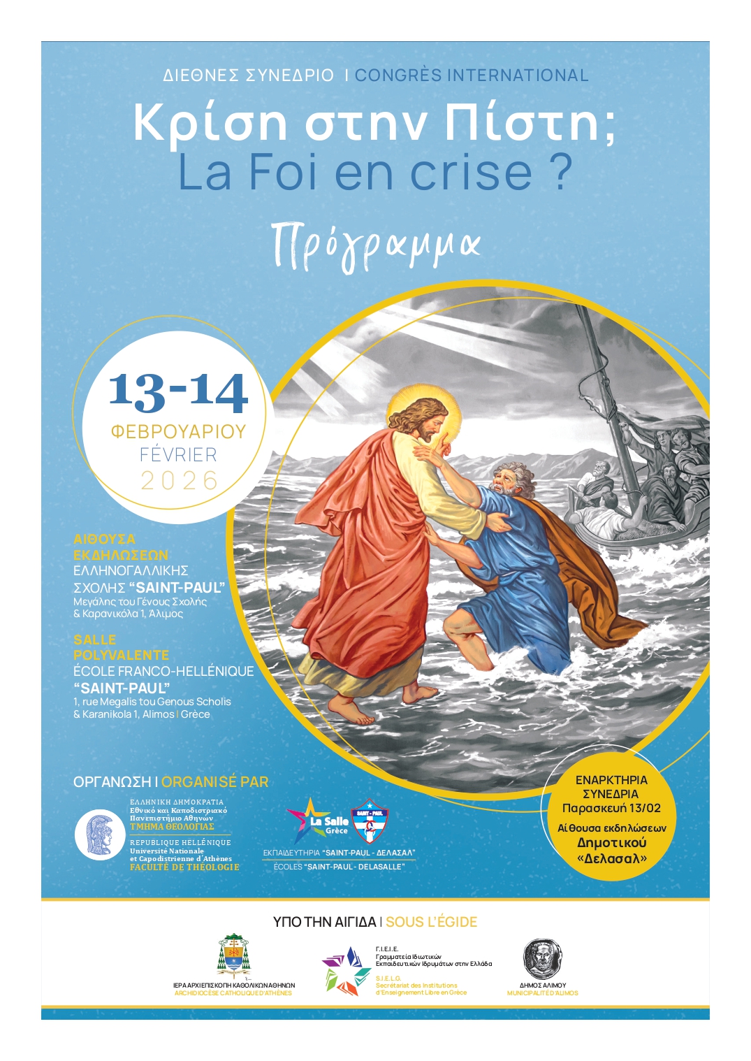 Με εξέχουσες παρουσίες από τον χώρο της εκκλησίας, της επιστήμης, της εκπαίδευσης, της πολιτικής και της δημοσιογραφίας θα πραγματοποιηθεί το Διεθνές Συνέδριο «Κρίση στην Πίστη;» στον Άλιμο, στις αίθουσες εκδηλώσεων του ∆ηµοτικού «∆ελασάλ» (Κυβέλης 19) και του «Saint-Paul» (Μεγάλης του Γένους Σχολής & Καρανικόλα 1).