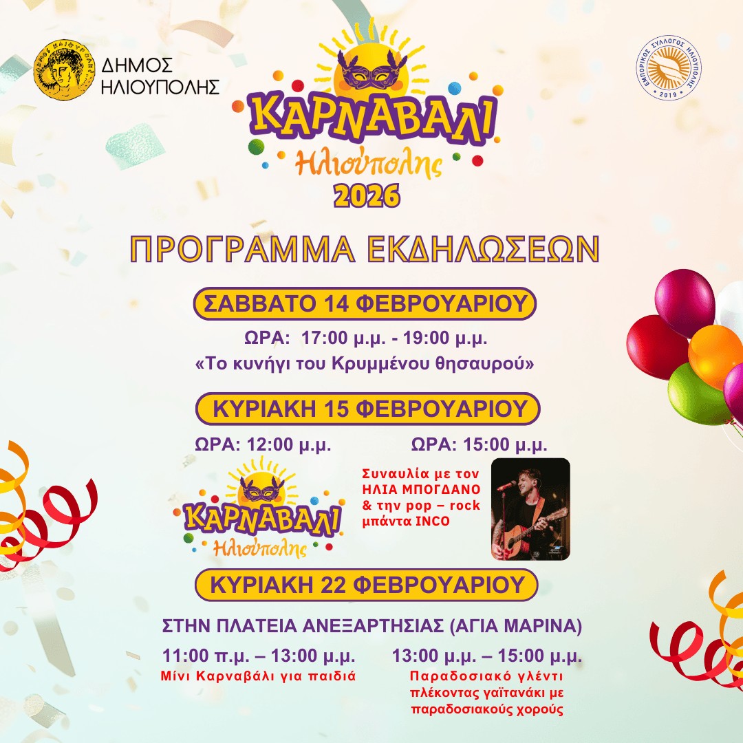Ο Δήμος Ηλιούπολης διοργανώνει και φέτος «Το Κυνήγι του Κρυμμένου Θησαυρού» στις 14 Φεβρουαρίου 2026, 16:00 – 18:00, όπου θα έχουμε την ευκαιρία να ανακαλύψουμε κρυφά σημεία της πόλης μας σε συνεργασία με το Σώμα Ελληνικού Οδηγισμού Τ.Τ. Ηλιούπολης.