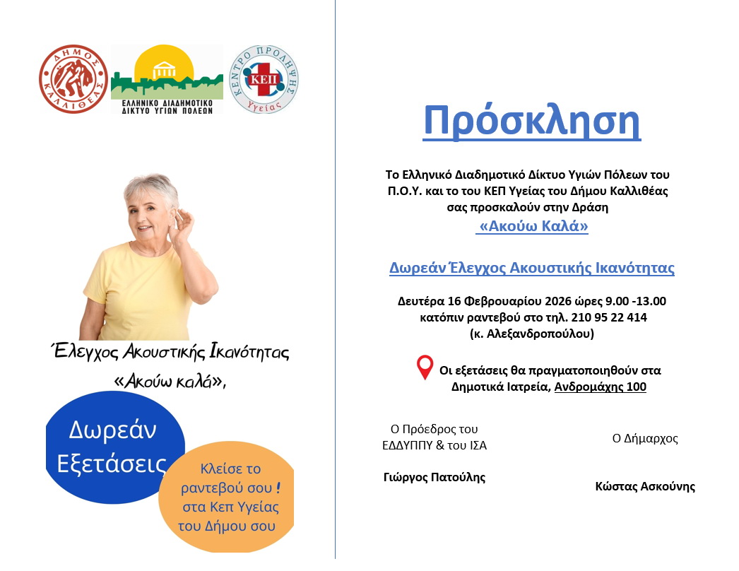 Το Ελληνικό Διαδημοτικό Δίκτυο Υγιών Πόλεων του Π.Ο.Υ., σε συνεργασία με το ΚΕΠ Υγείας Δήμου Καλλιθέας, διοργανώνουν μία δράση προληπτικού ελέγχου ακοής προσφέροντας δωρεάν εξετάσεις σε δημότες και κατοίκους.