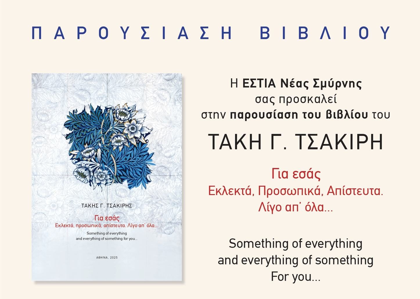 Η ΕΣΤΙΑ Νέας Σμύρνης προσκαλεί το κοινό στην παρουσίαση του βιβλίου του Τάκη Γ. Τσάκιρη, με τίτλο «Για εσάς: Εκλεκτά, Προσωπικά, Απίστευτα. Λίγο απ’ όλα…», με ομιλητές εκλεκτούς προσκεκλημένους και δωρεάν διάθεση του βιβλίου από τον συγγραφέα.