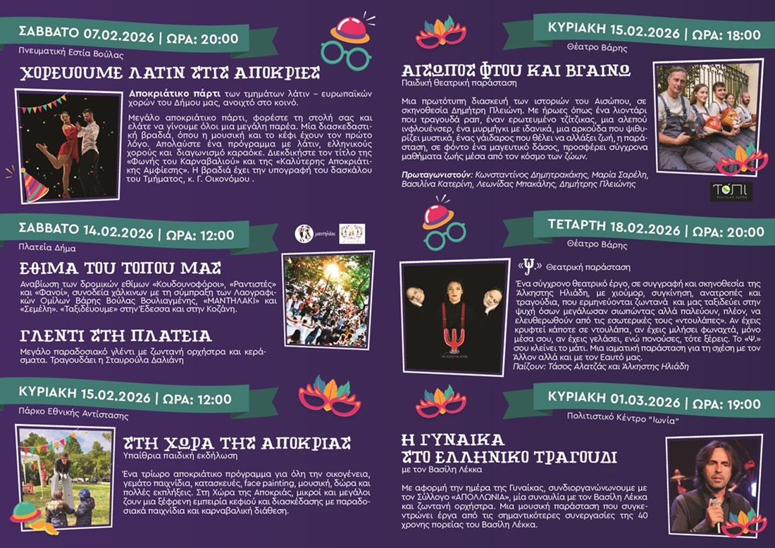 Ειδικότερα, με ένα πολυήμερο πρόγραμμα γεμάτο μουσική, χορό, παράδοση, θέατρο και οικογενειακή ψυχαγωγία, οι φετινές Απόκριες συνδυάζουν το σύγχρονο γλέντι με τα παραδοσιακά έθιμα της Ελλάδας, προσφέροντας μοναδικές εμπειρίες πολιτισμού και διασκέδασης σε κάθε γειτονιά του δήμου.