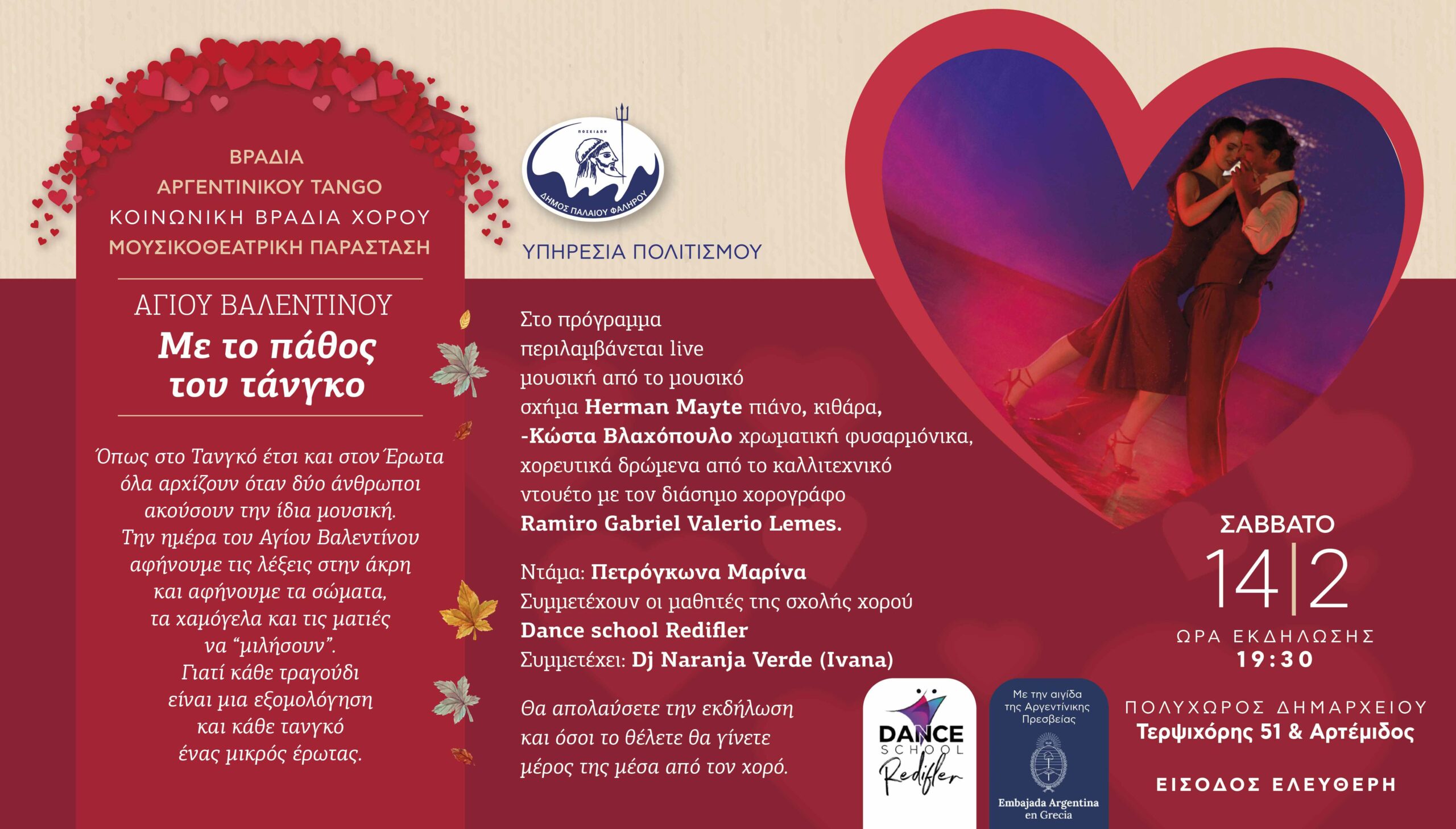Με μία βραδιά αφιέρωμα στο πάθος και την αυθεντικότητα του Αργεντίνικου τάνγκο, επιλέγει να γιορτάσει την ημέρα του Αγίου Βαλεντίνου, ο Δήμος Παλαιού Φαλήρου και η υπηρεσία Πολιτισμού.