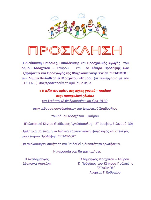 Η Διεύθυνση Παιδείας, Εκπαίδευσης και Προσχολικής Αγωγής του Δήμου Μοσχάτου – Ταύρου, σε συνεργασία με το Κέντρο Πρόληψης των Εξαρτήσεων και Προαγωγής της Ψυχοκοινωνικής Υγείας «ΣΤΑΘΜΟΣ» των Δήμων Καλλιθέας και Μοσχάτου – Ταύρου και με τη συνεργασία του Ε.Ο.Π.Α.Ε., διοργανώνουν ομιλία με θέμα: «Η αξία των ορίων στη σχέση γονιού – παιδιού στην προσχολική ηλικία».